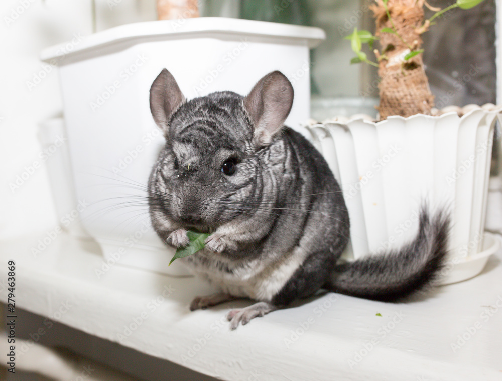 Grey Chinchilla Is Standing Near The Home Plant Cute Fluffy Pet Eating Leaves Stock Photo Adobe Stock